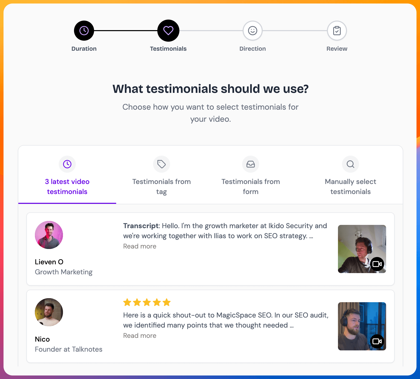 Choose “Create Magic Video”, set your duration, and pick your best testimonials.