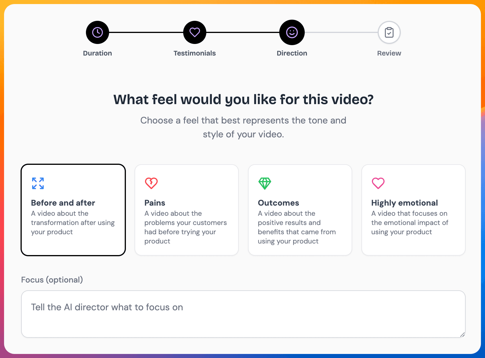Choose a narrative (Before-After, Pains, Outcomes, Highly Emotional) and a “Director” tier (Amateur ⚡️ or Spielberg 🎬).