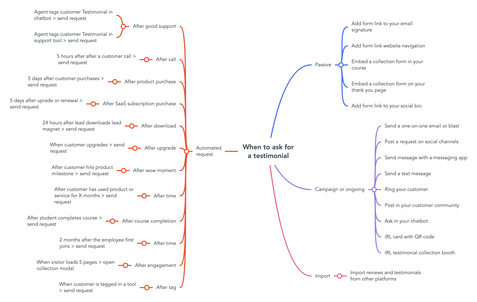 One of the most important things when asking for a testimonial is to ask at the right time. Traditionally people collect testimonials in three main ways: passive (adding a link somewhere), campaign (a specific marketing campaign around testimonials) or automated.