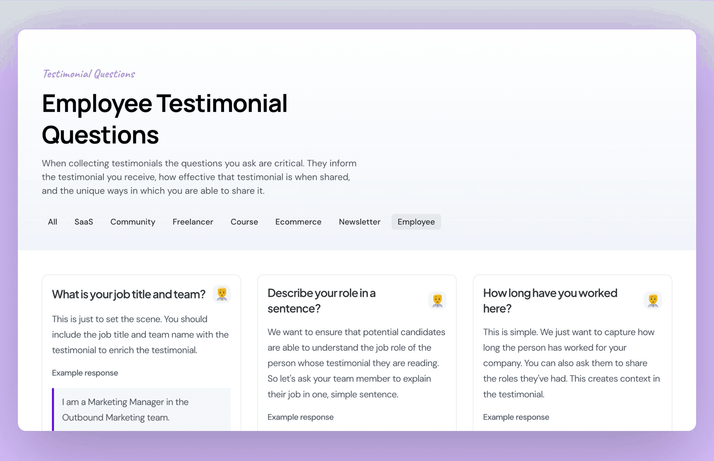 See more employee testimonial questions in Senja's testimonial question directory.