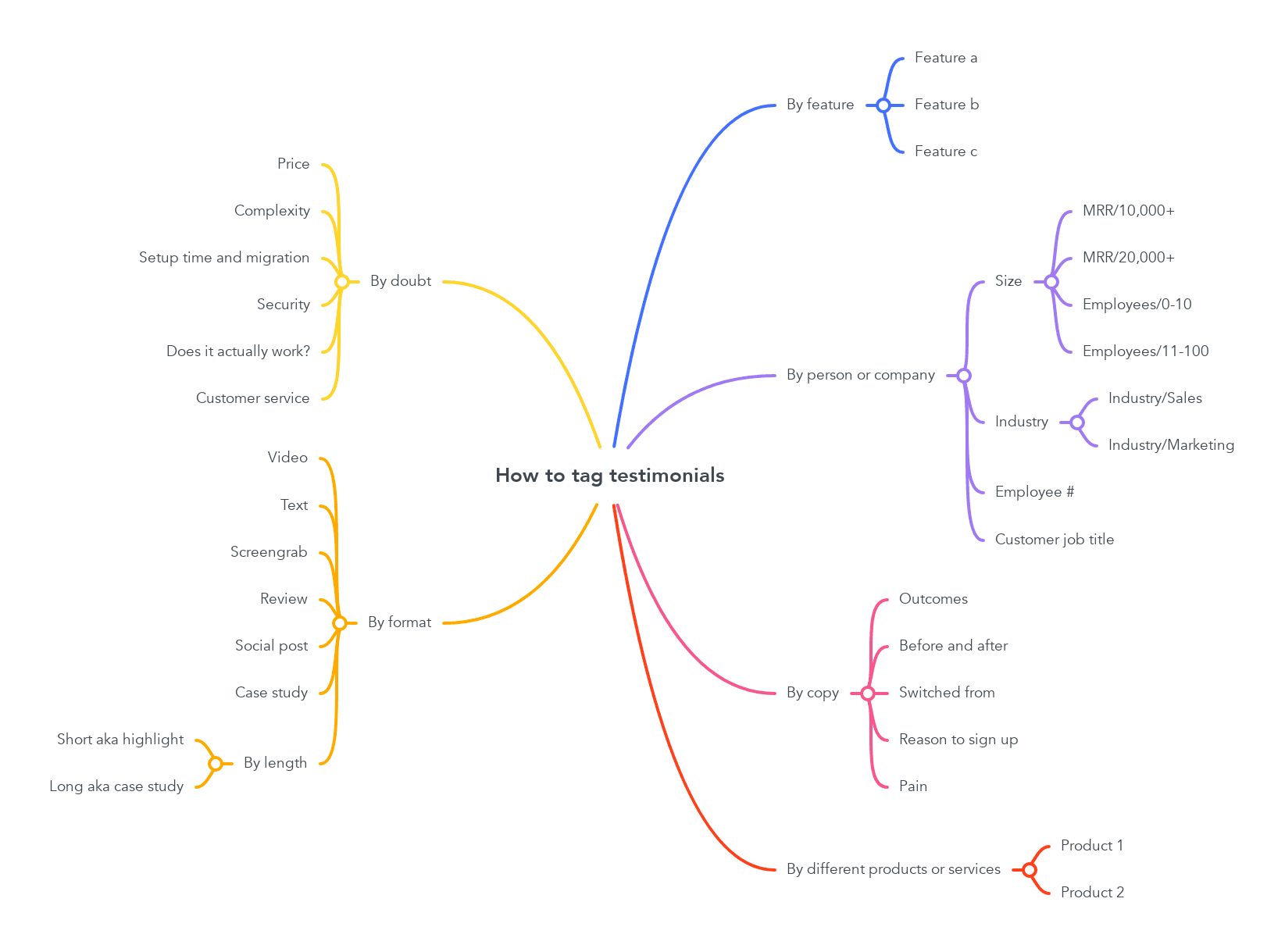You can use tags to group common themes like formats, copy, or objections. These are an interpretation of the testimonial and therefore may not be easily found by searching for keywords.