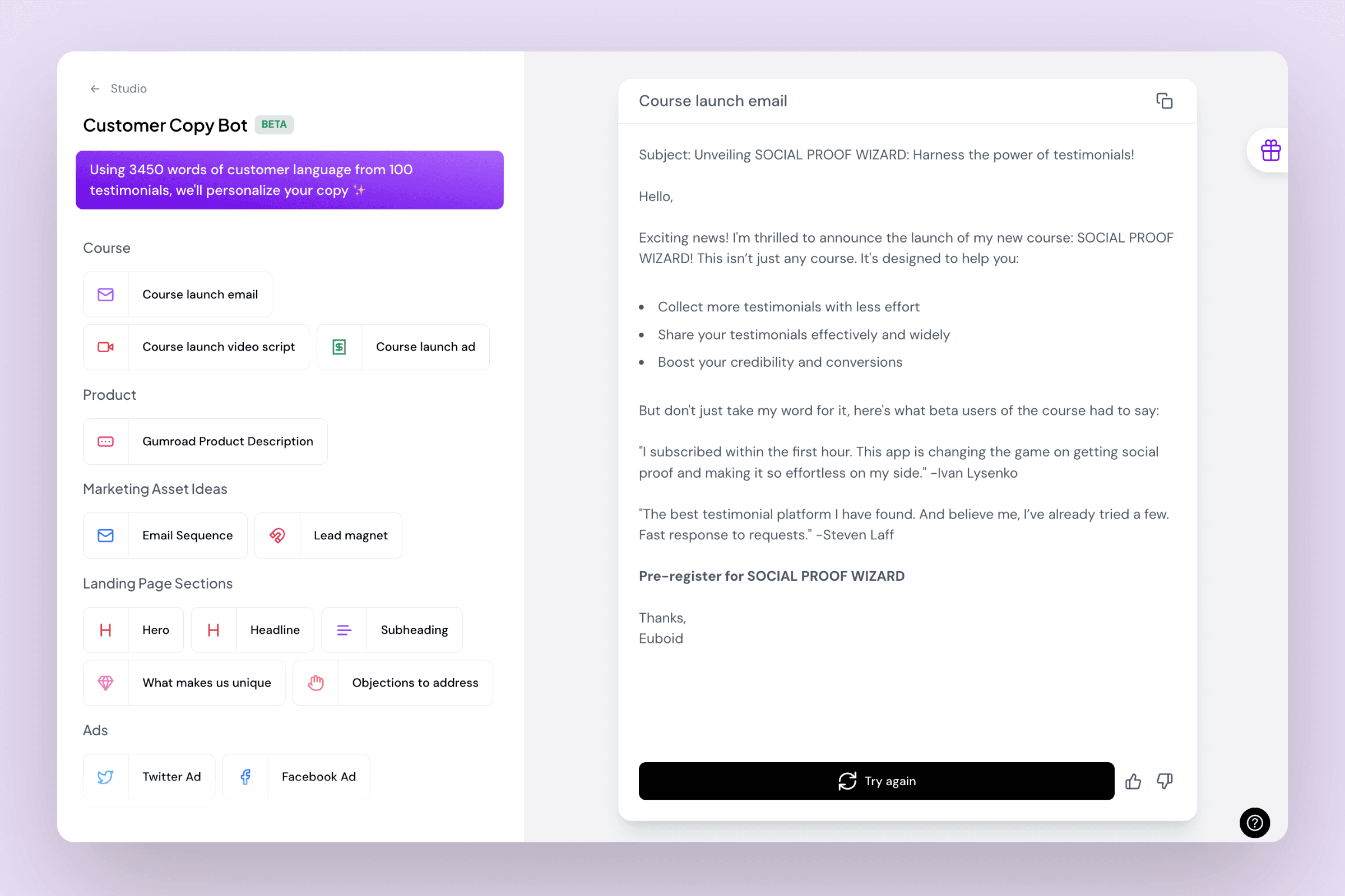 Just import your testimonials and Senja's Customer Copy bot will use them to create compelling course descriptions, sales emails, or ad copy. Saves a ton of time on the marketing side of course creation.