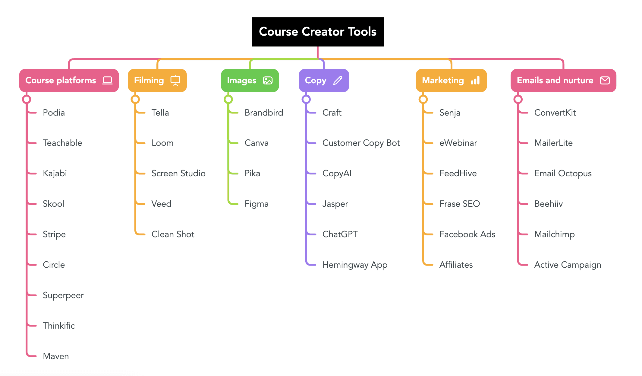 From the platforms you need to host your course to the tools you need to market it, we've got you covered. Here are all the tools we'll talk about: