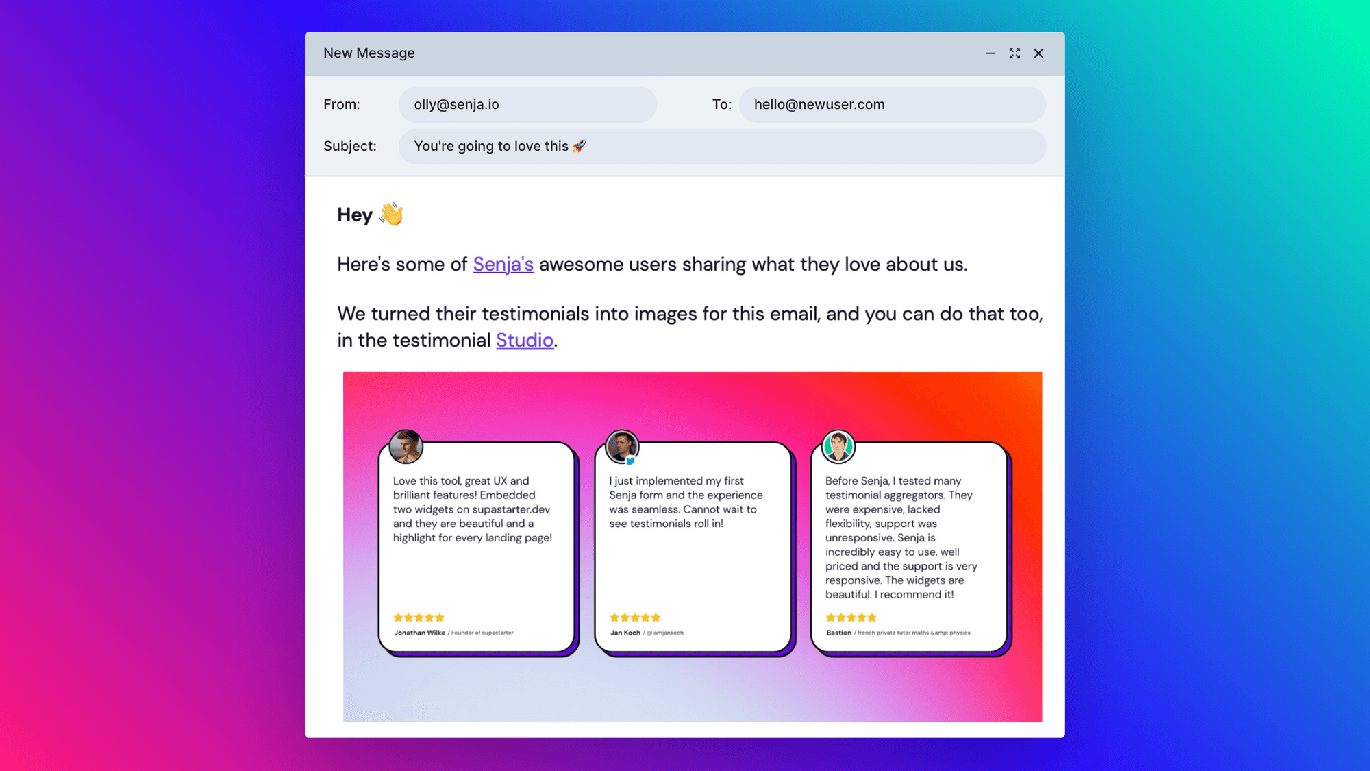 Example: on Senja, after people register, we send them a series of emails. One email highlights testimonials from our happy customers. You can do this too, or (even more easily) share your Wall of Love link in the email.