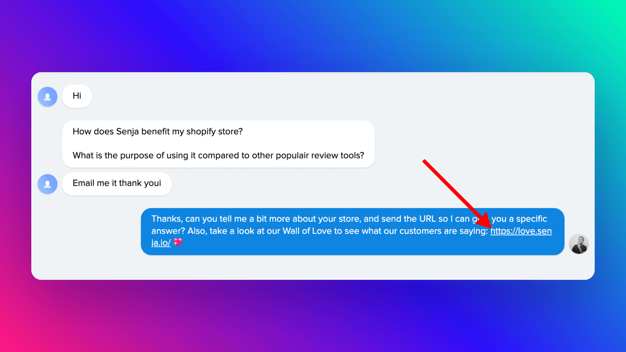 Chatbot enquiries from leads are a great time to share your Wall of Love link. They might be asking how your service works, why they should use it, or who else uses it. It's the perfect time to showcase your happy customers.