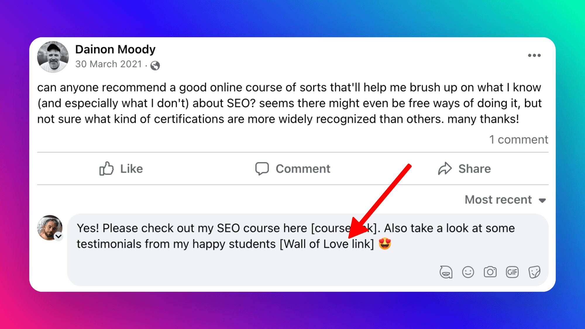 Share your Wall of Love link in online forums or communities where it may be relevant, such as online wedding planning communities, fitness communities, DIY communities, or family-oriented communities. Don't spam, but if anyone asks about your service you can include the link.