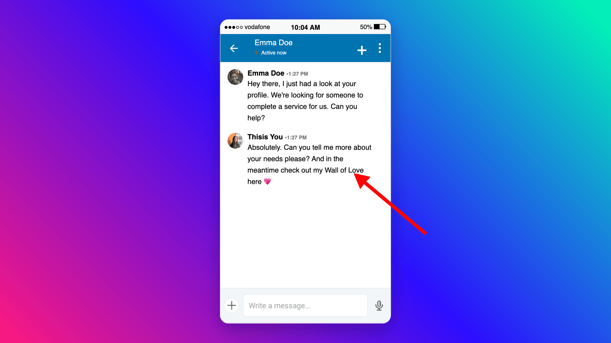 Like text messages or chatbots, you can share you Wall of Love in your DMs, on Instagram, Twitter, LinkedIn Messages or Facebook. Like this: