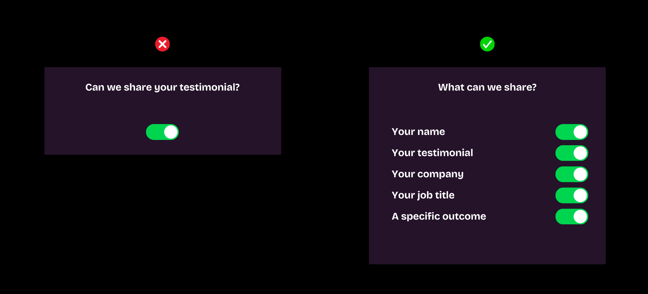 A more powerful way to collect testimonial consent is by allowing your customer to detail how each element can be shared.