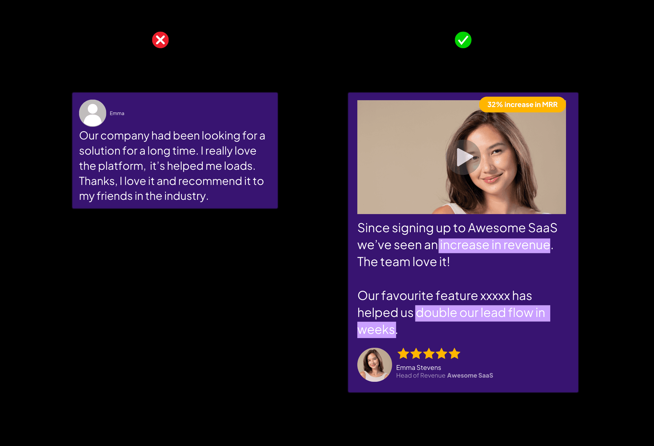 Testimonials are only useful if they are persuasive. Part of that is ensuring they're easy to scan for your visitor or lead. That's why we recommend you use testimonial highlights.