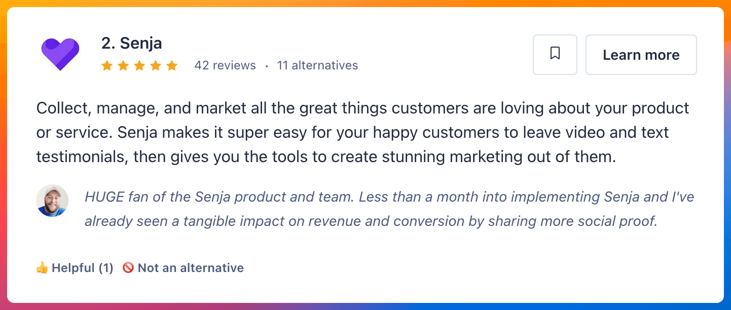 Test 2-3 with free trials. For most, Senja.io is the upgrade: Cheaper, feature-rich, and proven to double sales.