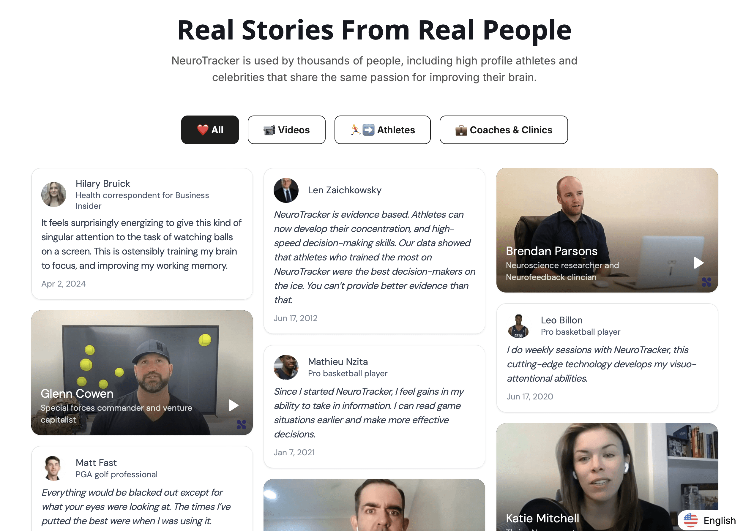 NeuroTracker uses their Wall of Love to highlight how different kinds of people get value from their tool. This is by adding Wall of Love filters. See it in action