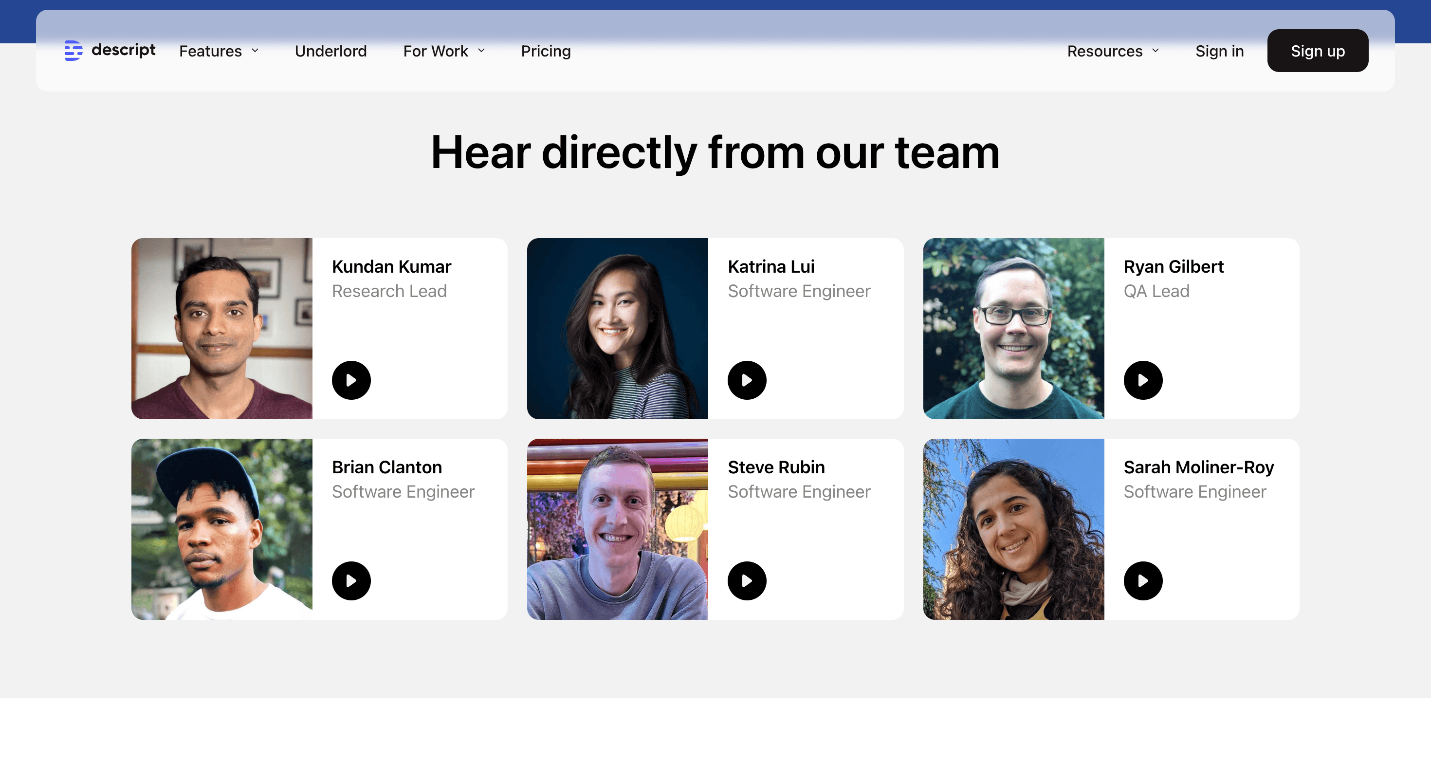Hiring talented team members is tough. And some of the best candidates are extremely fussy. Which is why an employee Wall of Love is a great idea. Use it to showcase your team and their opinions of working at your company, like Descript have. It's a more human and authentic way to showcase what your company is about. Add it to your recruitment pages. See it here
