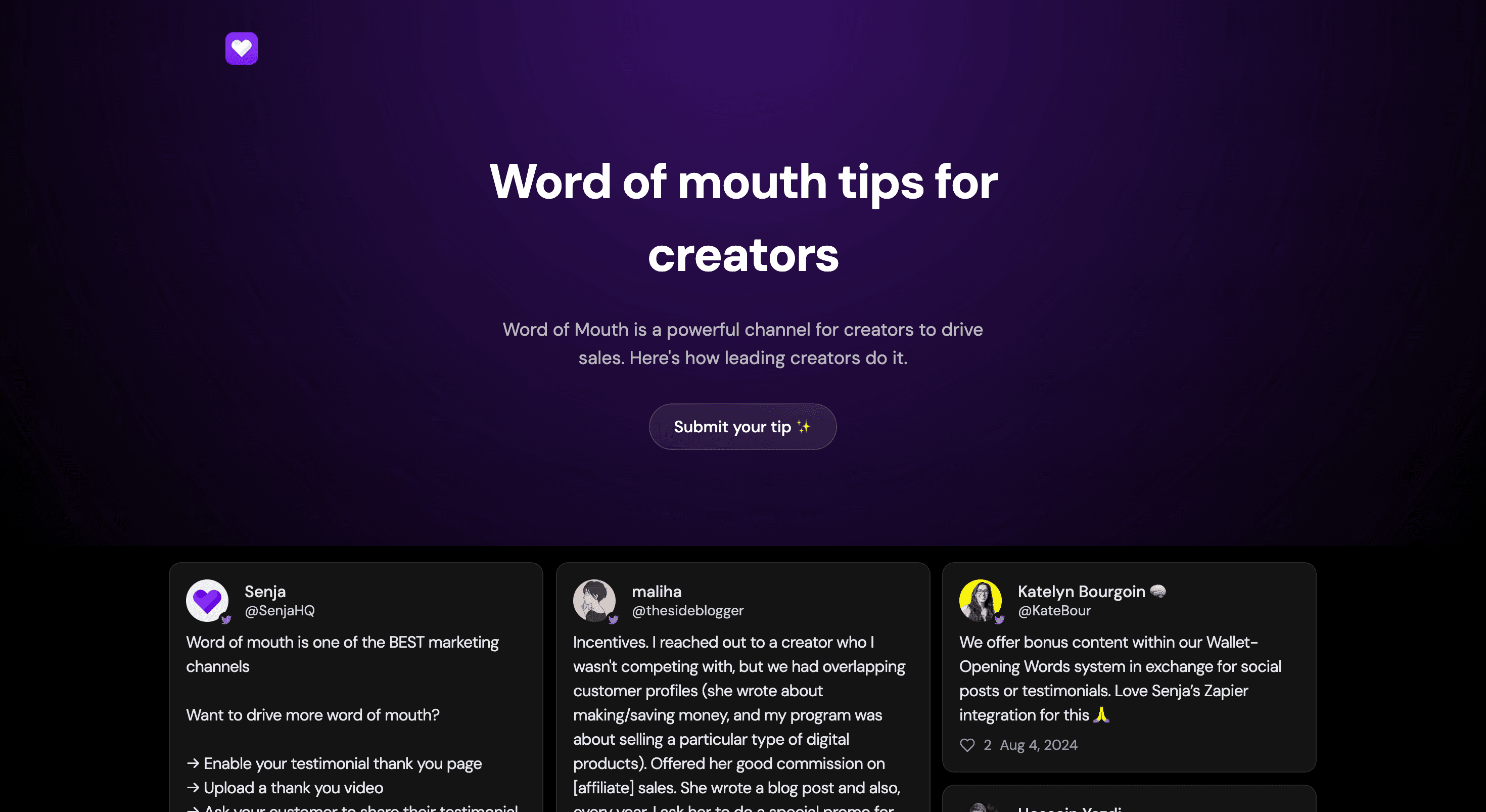 Looking for a unique way to collect and share knowledge from your customers or industry experts? Why not use a Senja Wall of Love and either link to it, or embed it directly into your blog post or page? In this example we asked our customers to share tips for marketing their creator business. See it here