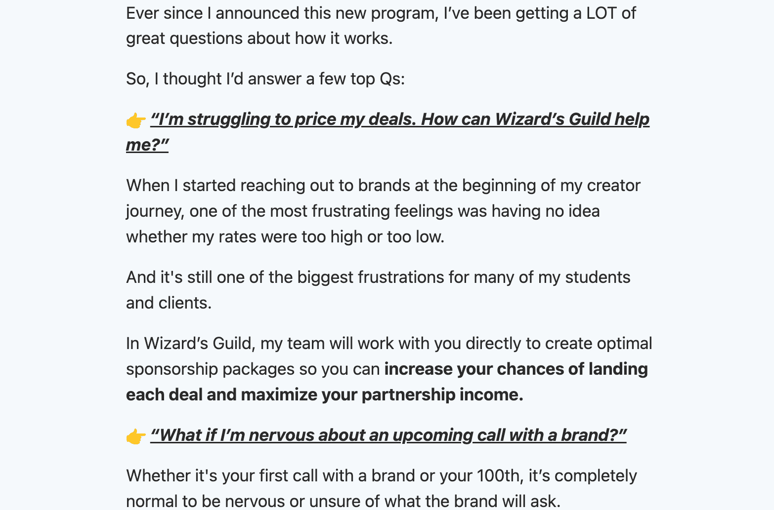 See it in action: Justin Moore from Creator Wizard sent this gorgeous hesitations email about his Wizard's Guild program. This is easy to create when you have your testimonials tagged.