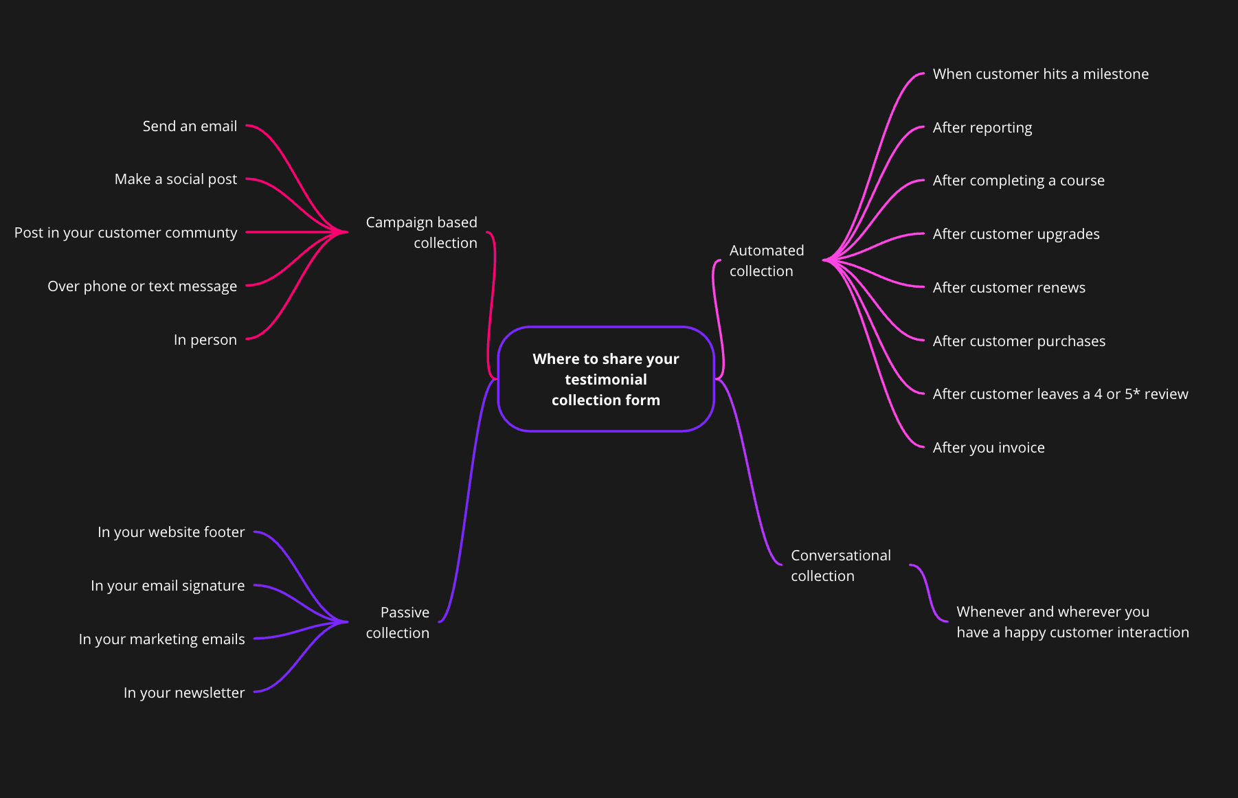 Here are 14 times and places our awesome users share their Senja form to collect more testimonials. For clarity, I've broken this down into 4 different types of collection: campaign-based, automatic, passive and conversation-based.