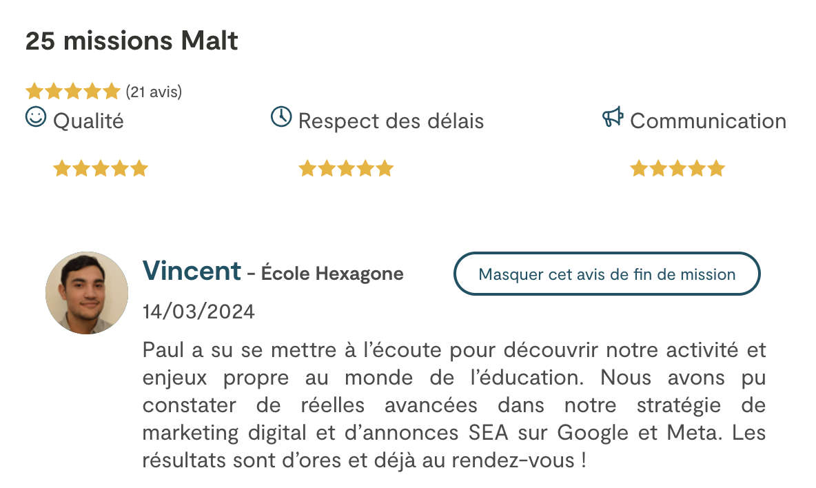 Paul a su se mettre à l'écoute pour découvrir notre activité et enjeux propre au monde de l'éducation. Nous avons pu constater de réelles avancées dans notre stratégie de marketing digital et d'annonces SEA sur Google et Meta. Les résultats sont d'ores et déjà au rendez-vous !